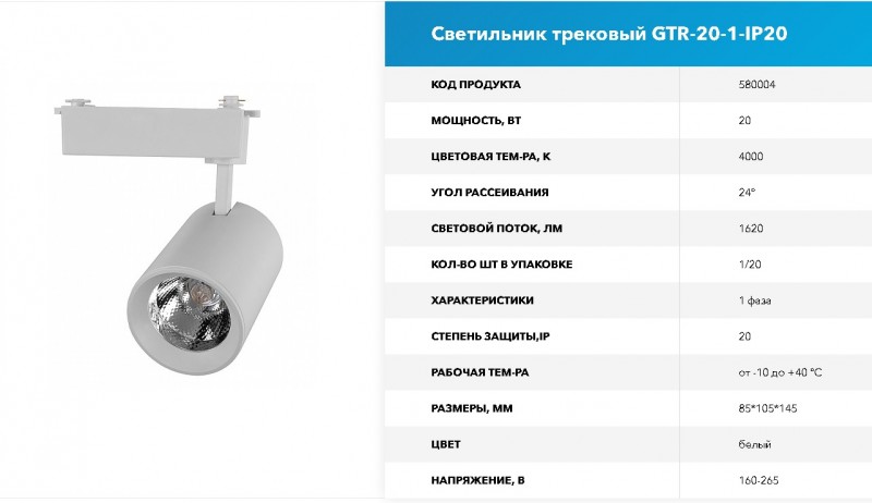 Светильник трековый 20 Вт 1 фаза GTR-20-1-IP20 белый 4000К, 85*105*145мм GNRL RSP (1/20)